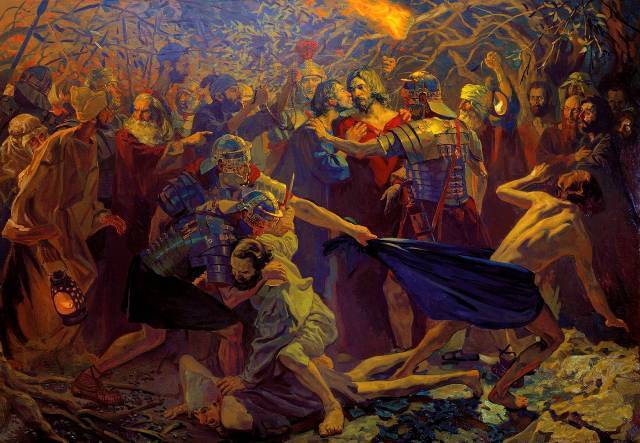 “Judas Betrays Jesus With A Kiss”, painting by Russian Pavel Popov from arthive.com; notice young man fleeing from the scene naked believed to be St. Mark.